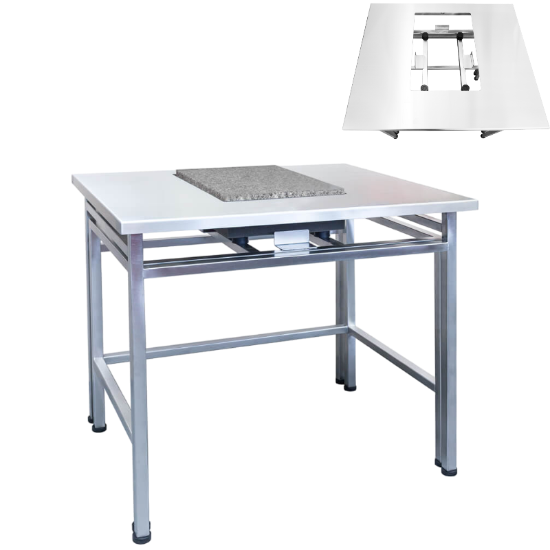 SA-stabilitetsbordene bruges til at isolere mikro- og analysevægte fra vibrationer og ujævne underlag. De består af en pulverlakeret stålkonstruktion som bærer et massivt granitbord, som er understøttet af anti-vibrationsdæmpere. Understellet er lavt, så brugeren ikke løfter tunge prøver op i højden.